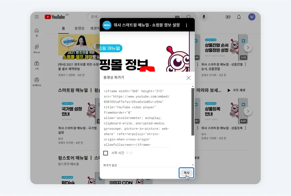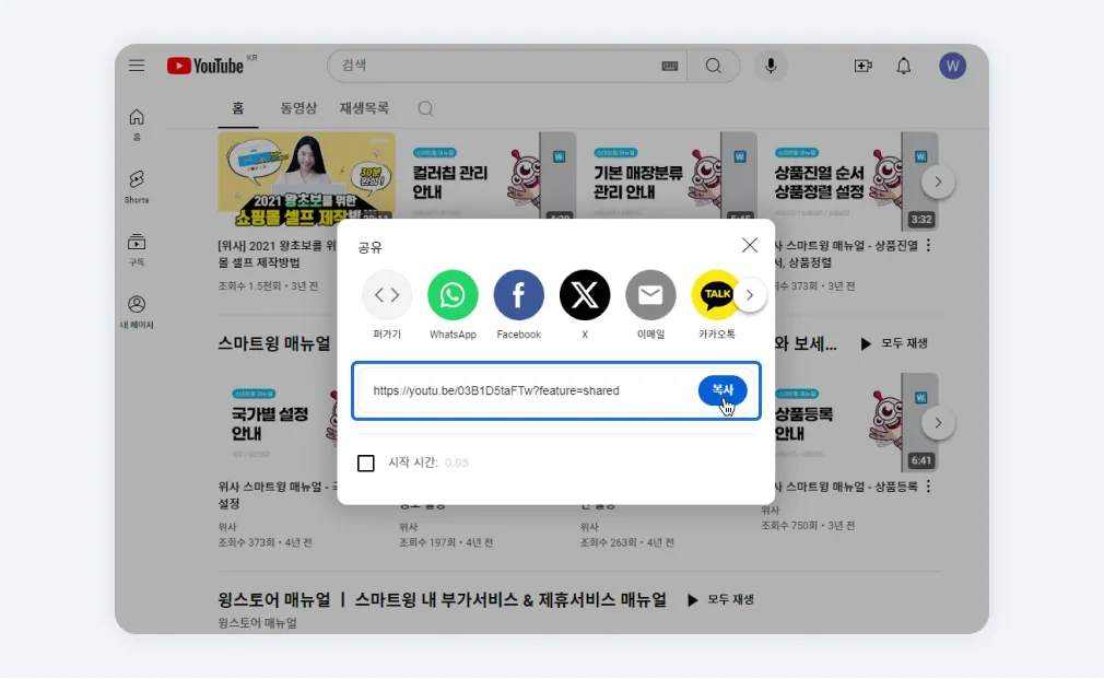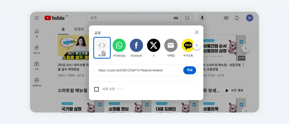 유튜브/비메오에 접속하여 삽입할 영상 URL을 복사합니다.