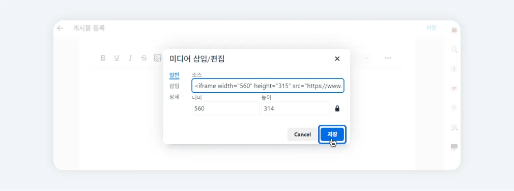 에디터 영역에서 상단 미디어 삽입 아이콘을 클릭하고 일반>소스에 URL을 붙여넣고 노출할 영역 사이즈(너비X높이)를 확인 또는 수정합니다.