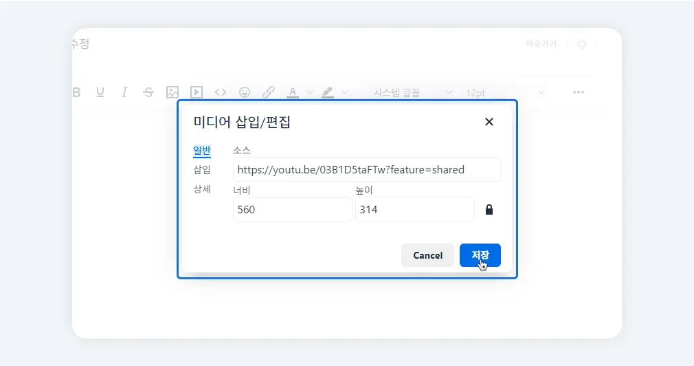 유튜브/비메오 영상 URL 또는 iframe 태그를 복사하여 삽입할 수 있습니다.