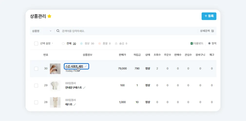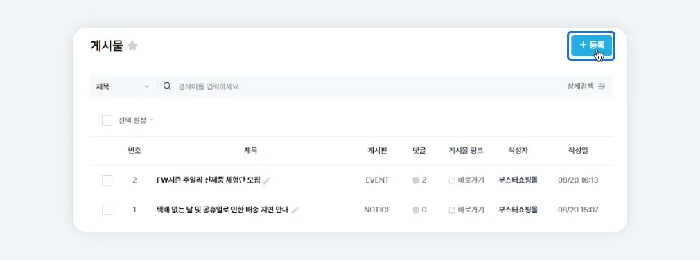 관리자>게시물 또는 상품 카테고리에서 신규 등록 또는 기존 게시물 수정 페이지로 진입합니다.