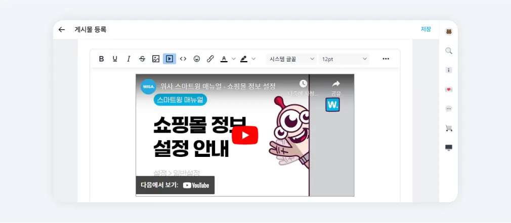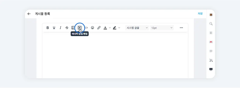 에디터 영역에서 상단 미디어 삽입 아이콘을 클릭하고 삽입에서 복사한 코드를 붙여넣고 표시되는 화면을 확인합니다.