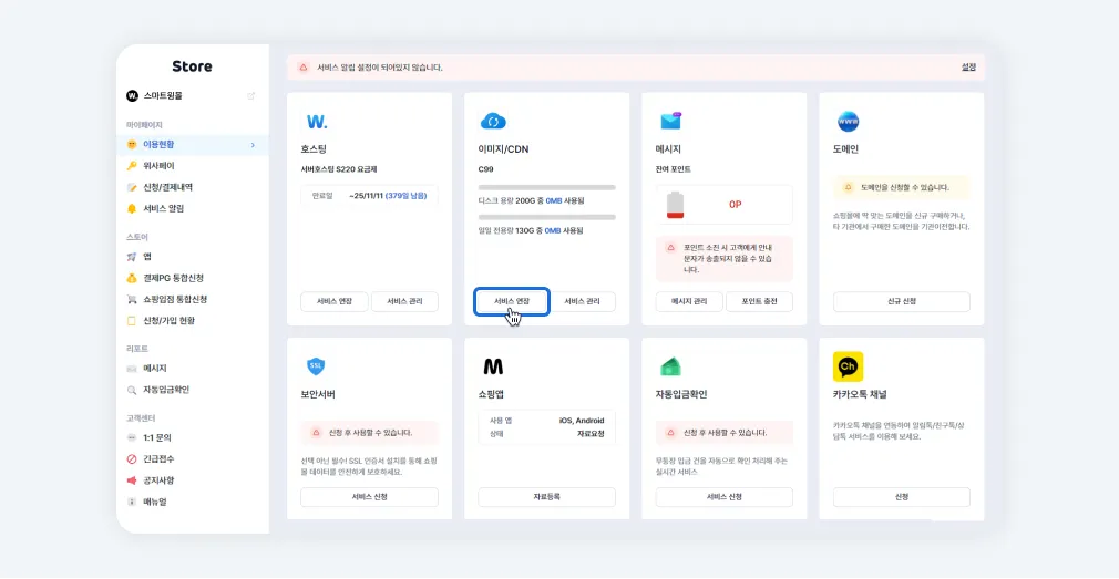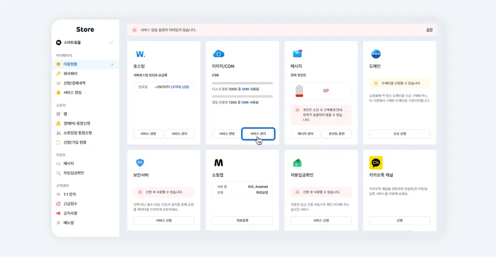 윙스토어>마이페이지>이용현황에서 이미지/CDN [서비스 관리] 버튼을 클릭합니다.