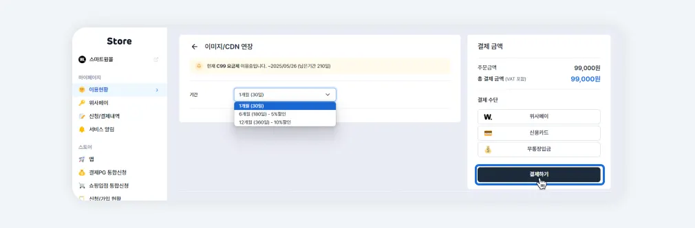 윙스토어>마이페이지>이용현황에서 이미지/CDN [서비스 연장] 버튼을 클릭합니다.