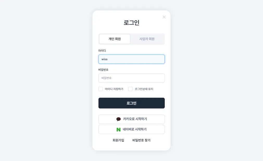 PC 또는 모바일웹 위사 홈페이지에서 계정정보를 입력하여 로그인합니다.