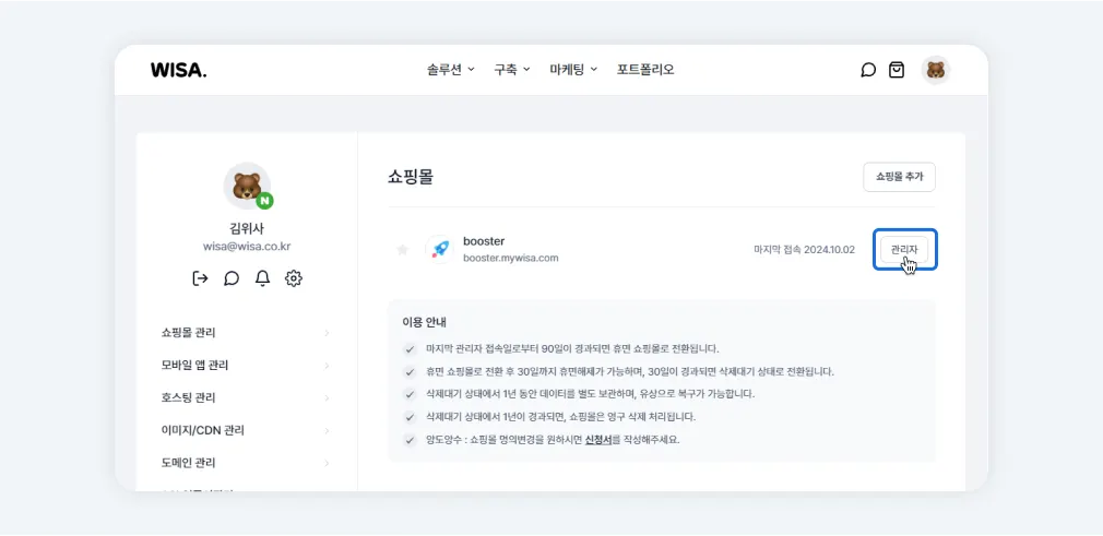 생성한 쇼핑몰 목록을 확인할 수 있으며, 운영 중인 쇼핑몰의 [관리자] 버튼을 클릭하면 관리자 화면으로 이동합니다.