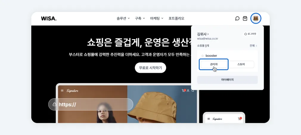 우측 상단 프로필 아이콘을 클릭하면 운영 중이 쇼핑몰 리스트가 노출됩니다. 관리자 접속을 원하는 쇼핑몰의 [관리자] 버튼을 클릭하면 관리자 화면으로 이동합니다.