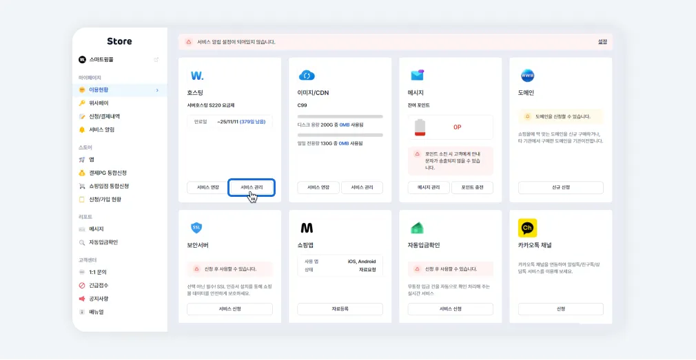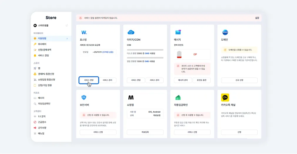 윙스토어>마이페이지>이용현황에서 호스팅 [서비스 관리] 버튼을 클릭합니다.