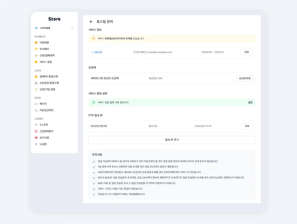 서비스 정보 : 사용 중인 호스팅 이용기간 확인 및 연장 가능