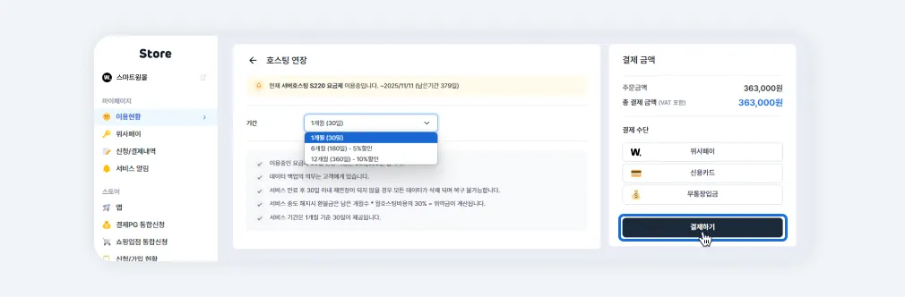 스마트윙 전문가 버전 이용 시 호스팅 연장 및 관리 방법을 안내해드립니다.