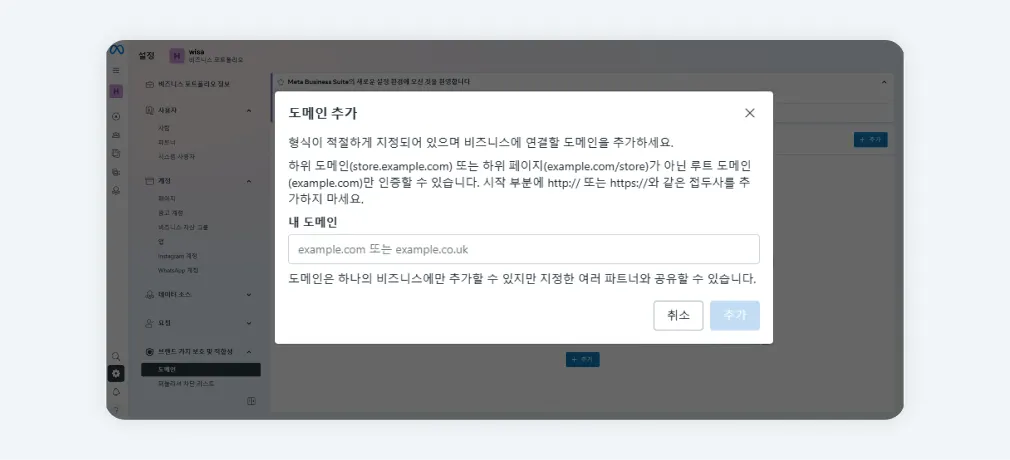 메타 비즈니스>설정>브랜드 가치 보호 및 적합성>도메인 메뉴에서 [ 추가] 버튼을 클릭하여 도메인 만들기를 선택 후 도메인을 입력합니다.