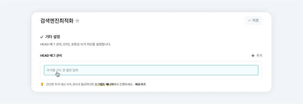 관리자>마케팅>마케팅 도구>검색엔진최적화 메뉴에서 기타 설정>HEAD 태그 관리 항목에 복사한 메타태그를 입력하고 [ 저장] 하세요.