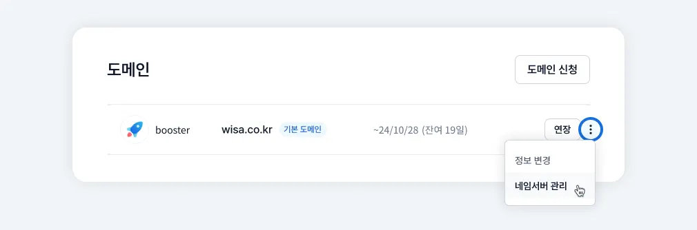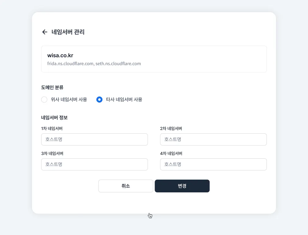 도메인 네임서버는 도매인 구매처에서만 변경할 수 있습니다. 타사 도메인일 경우에는 구매한 곳에서 변경을 진행하세요.