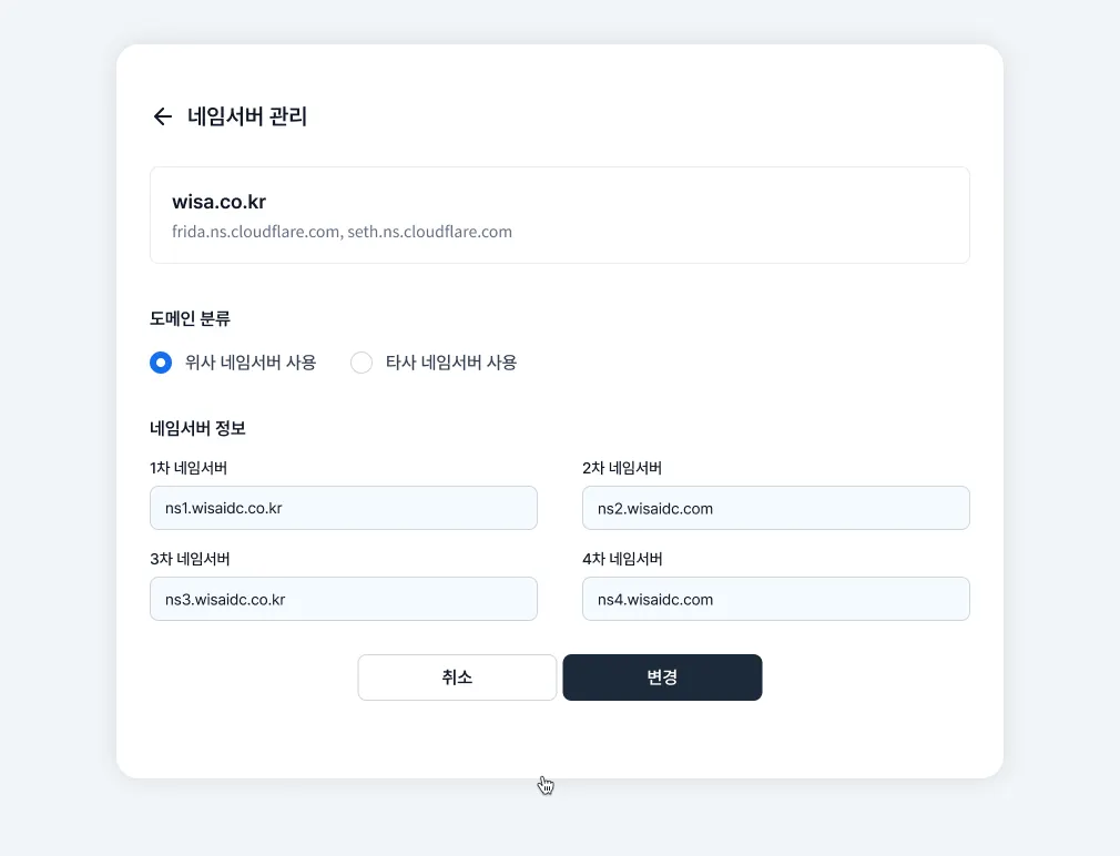 [위사 네임서버 사용] 클릭 후 [변경] 버튼을 눌러주세요.