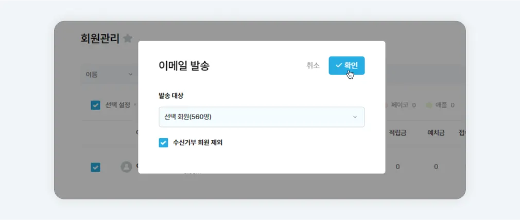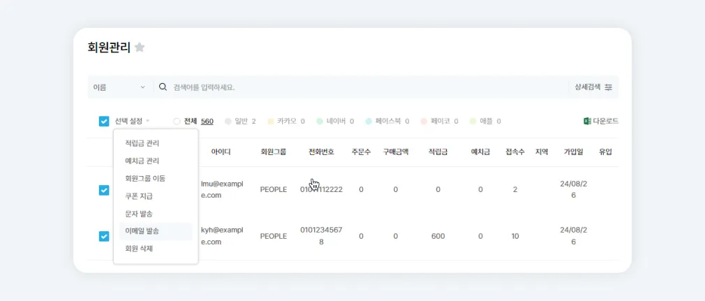 관리자>회원>회원>회원관리 메뉴에서 메일을 발송할 회원을 선택하여 일괄 발송할 수 있습니다.