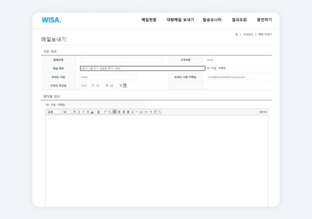 팝업 페이지에서 메일 보내기 외에도 금액 충전, 발송 모니터 및 발송 결과조회를 확인할 수 있습니다.