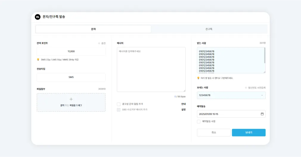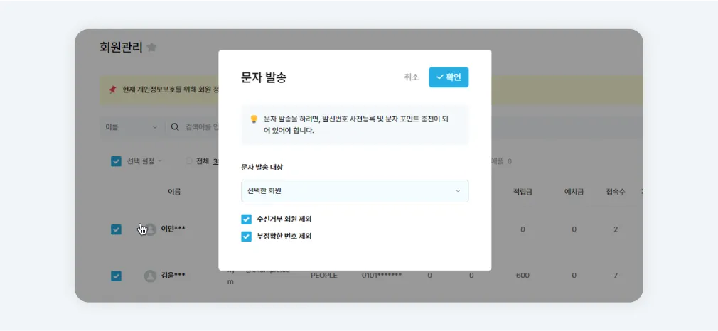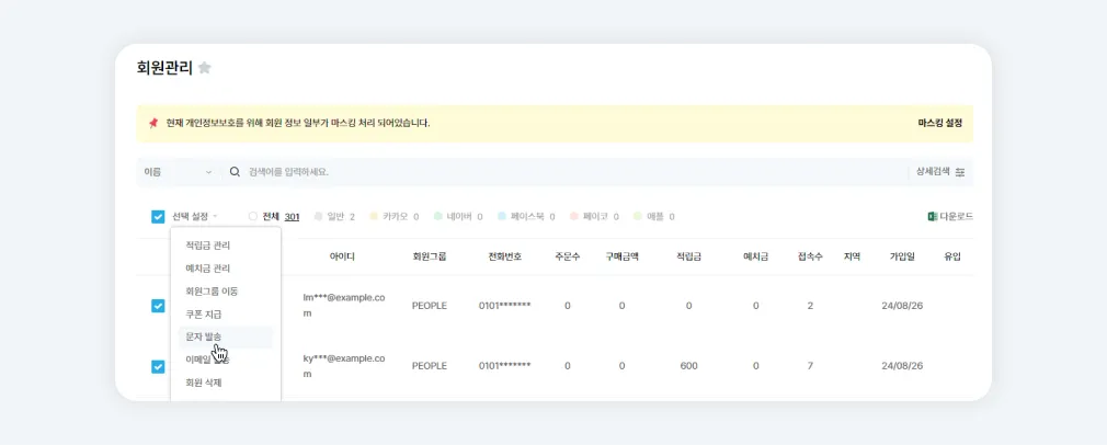 쇼핑몰 가입 회원 전체 선택해서 문자 메시지를 발송할 수 있습니다.