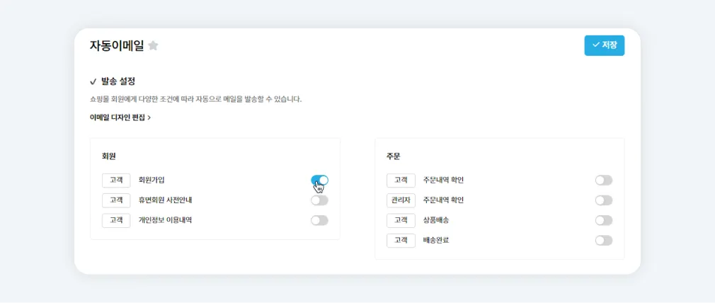 관리자>설정>알림>자동이메일>발송설정에서 상황별로 사용할 자동이메일 설정을 ON/OFF할 수 있습니다.