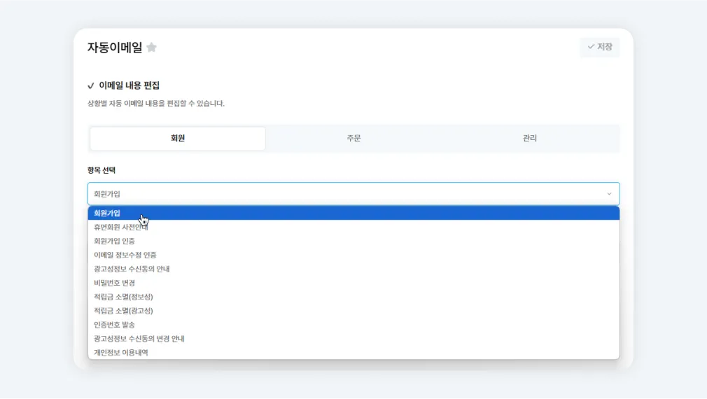 회원/주문/관리 중 한가지 탭을 클릭하고 항목 선택에서 수정할 자동 이메일 폼을 선택합니다.