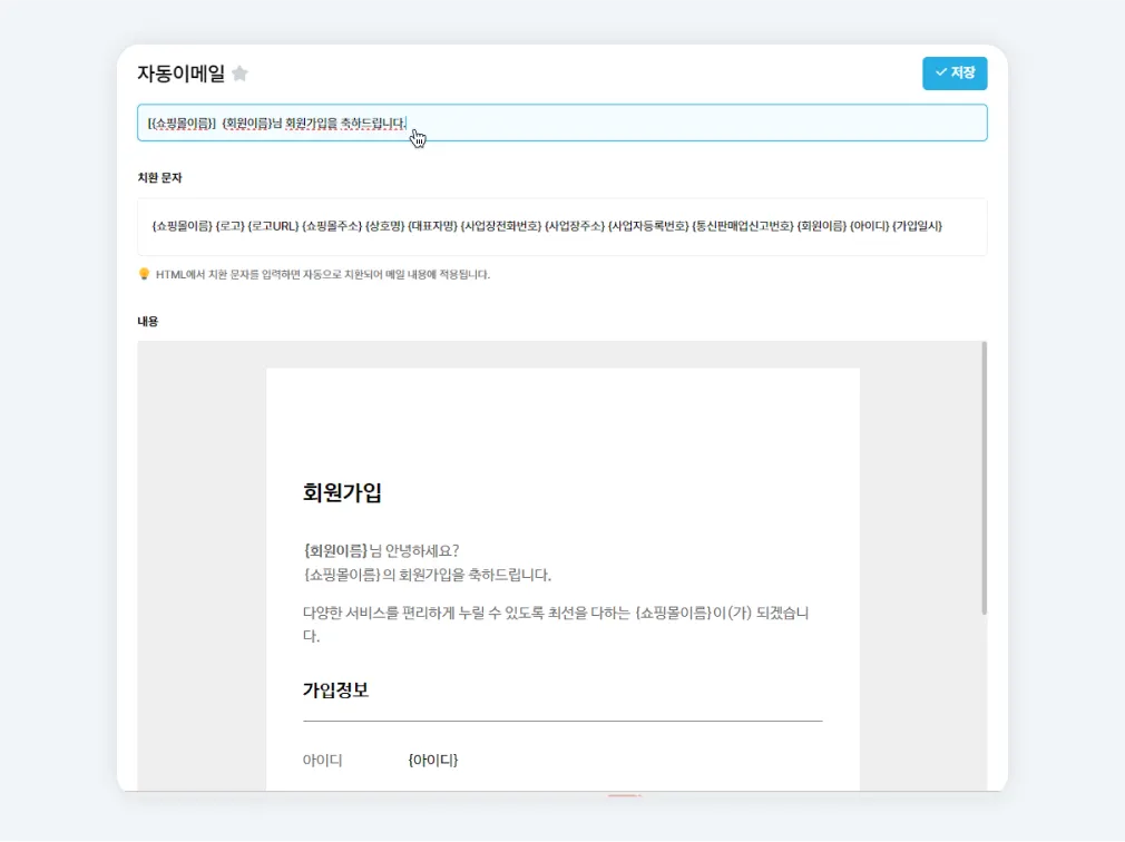 관리자>디자인>디자인>자동이메일에서 상황별로 자동이메일 내용을 직접 편집할 수 있습니다.