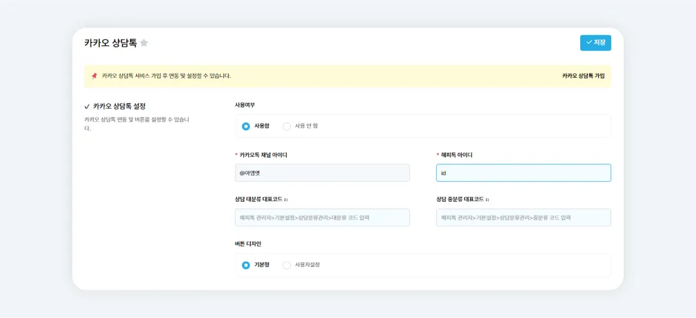 먼저 제휴 서비스 가입 후 관리자에서 연동을 진행하면 상담톡을 사용할 수 있습니다.