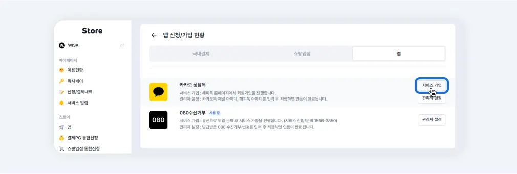 스토어>스토어>신청/가입현황에서 [관리자 설정] 버튼을 클릭하면 해당 페이지(관리자>앱>고객>카카오 상담톡)로 이동합니다.