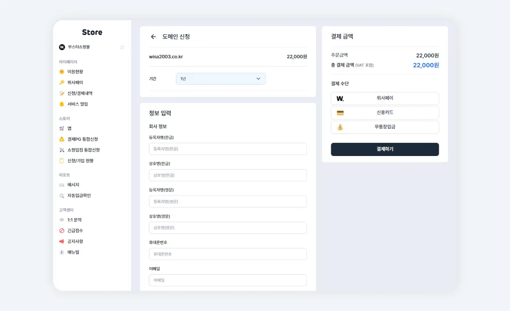 위사 홈페이지 또는 스토어에서 사용하고 싶은 도메인 주소를 검색해서 구매할 수 있습니다.