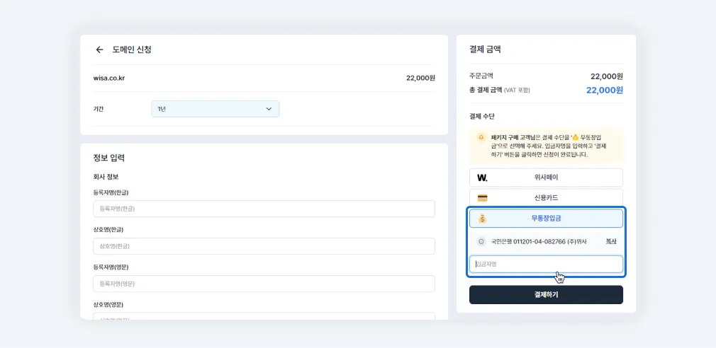 3. 도메인 신청 페이지에서 결제 수단을 [무통장 입금]으로 선택하세요. 입금자명을 입력하고 '결제하기' 버튼을 클릭하면 신청이 완료됩니다.
