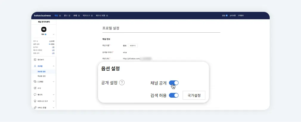 카카오톡 채널 관리자 센터>채널 접속> 프로필>프로필 설정 메뉴 접속
