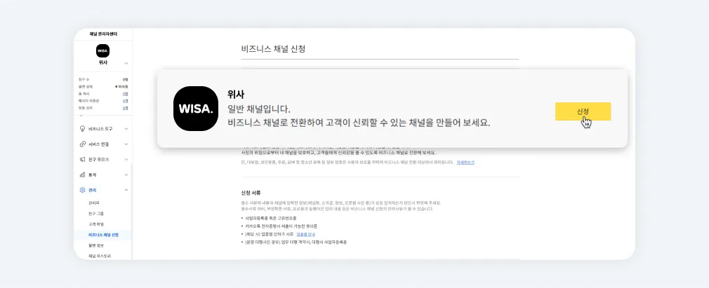 관리>비즈니스 채널 신청 메뉴 접속