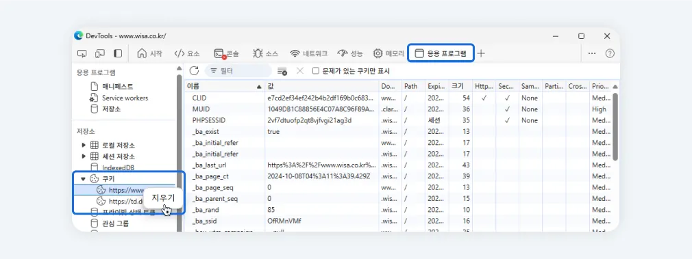 응용 프로그램>쿠키 더블 클릭>페이지 URL 확인 후 마우스 오른쪽 클릭>지우기 클릭