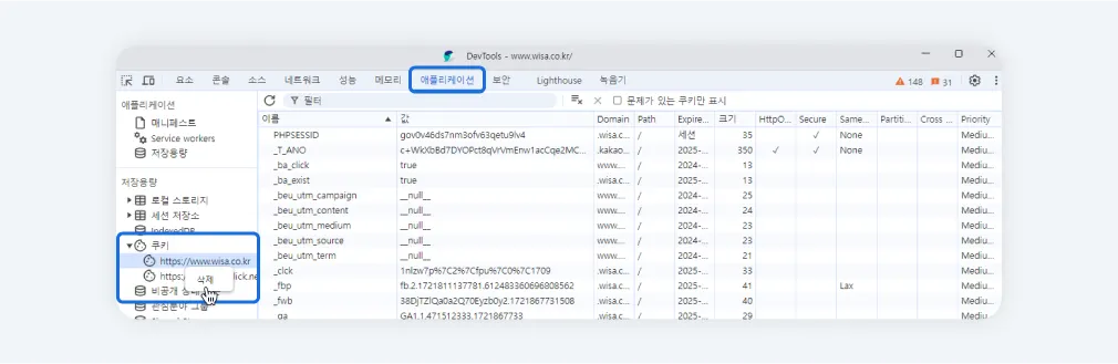브라우저별로 개발자도구에 진입하여 페이지 쿠키를 삭제할 수 있습니다. 아래에서 크롬, 웨일, 엣지 브라우저 쿠키 삭제 경로를 확인하세요.