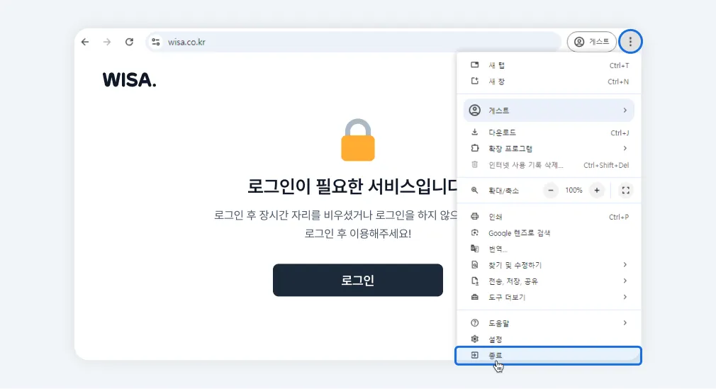 캐시 및 쿠키가 일시적으로 남아있을 수 있으므로 다른 브라우저에서 관리자 접속을 시도해주세요.