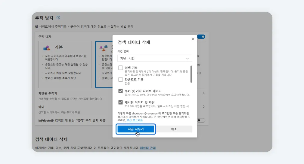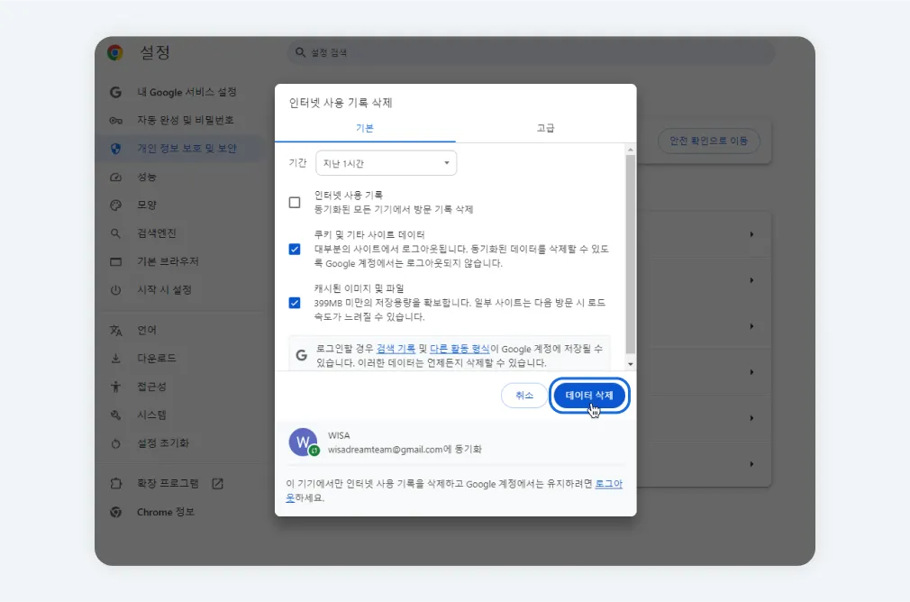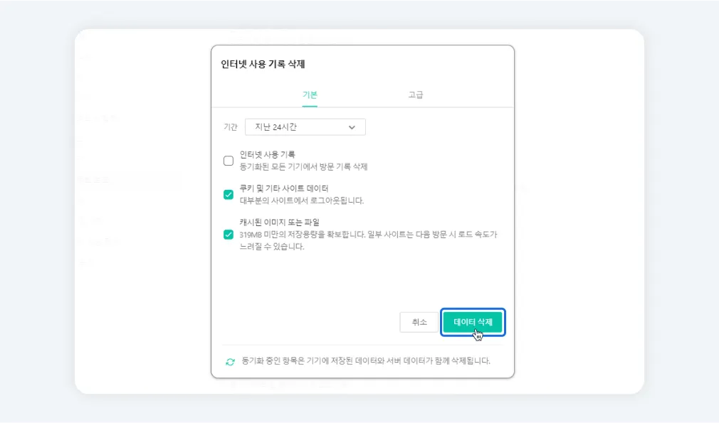 해당 방법으로 데이터 삭제 시 대부분의 사이트에서 로그아웃되므로 원치 않을 경우 3번 방법을 권장해 드립니다.