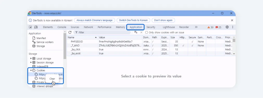 애플리케이션>쿠키 더블 클릭>페이지 URL 확인 후 마우스 오른쪽 클릭>삭제 클릭
