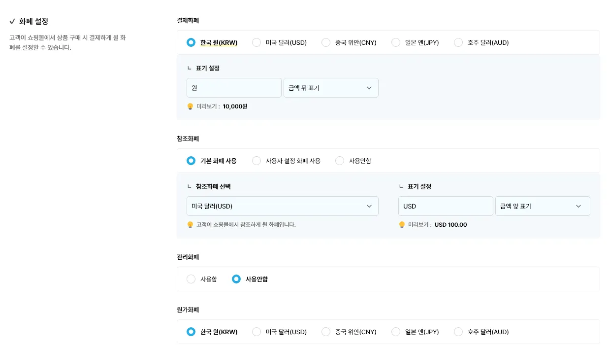 결제화폐 : 고객이 쇼핑몰에서 상품 구매 시 결제하게 될 화폐를 설정할 수 있습니다. 표기 방법에 예시) $, USD 문자를 입력 시 금액의 앞 또는 뒤에 삽입한 문자가 노출됩니다.
