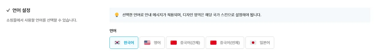 언어 : 쇼핑몰에서 사용할 언어를 선택할 수 있습니다. 선택한 언어로 안내 메시지가 적용되며, 디자인 영역은 해당 국가 스킨으로 설정해야 됩니다